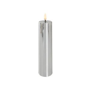Be mesmerised by the magic of LED candles with our Chrome LED Trueflame� Flickering Pillar Candle in Silver, which gives a cosy ambience like a real flame candle. It provides a child and outdoor-safe alternative for decorating your home, weddings and any special events.