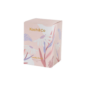 Perfect for home decor, floristry shops, or hamper gifting, this candle is beautifully packaged in a botanical-themed box that is completely recyclable and plastic-free. This candle has been poured into an opaque vessel that features gold detailing and a clear glass foot base. It also includes a snug-fitting and curvy transparent glass lid.