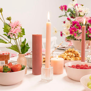 Our clear glass candlestick or taper candle holder is a classic. Subtle in its textured effect, this candle holder is well-suited to a clean decorating aesthetic, for both event or home decor.
