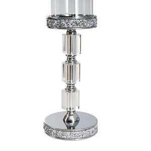 Introducing our Silver Pillar Candle Holder, a testament to refined design and timeless elegance. Standing regally at 38cm, this majestic piece serves as a captivating focal point for any setting. The sleek silver finish with diamante details imparts a modern sophistication, beautifully complementing the stature of pillar candles. With a substantial 12cm diameter base, stability is assured, allowing you to showcase this exquisite holder on tables, shelves, or mantles with confidence. The candle holder comes in 3 parts which needs to be assembled together. The glass sleeve measures 12.5cm tall and the outer diameter measures 9cm with the inner diameter being 7.5cm. Pillar candles of up to 7cm in diameter can fit. The holder has a magnetic funtion which secures the glass sleeve and prevents it from moving around.