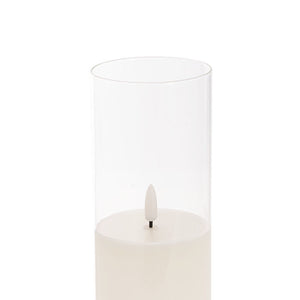 Be mesmerised by the magic of LED candles. This Glass Trueflame� Flickering Led White pillar candle gives a cosy ambiance like a real candle. It is a safe alternative to decorate your home, weddings and any special events. Featuring a glass holder filled with real wax, long battery lighting life and a realistic flameless glow.