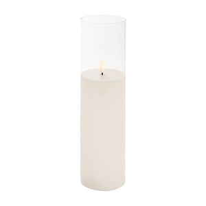 Be mesmerised by the magic of LED candles. This Glass Trueflame� Flickering Led White pillar candle gives a cosy ambiance like a real candle. It is a safe alternative to decorate your home, weddings and any special events. Featuring a glass holder filled with real wax, long battery lighting life and a realistic flameless glow.