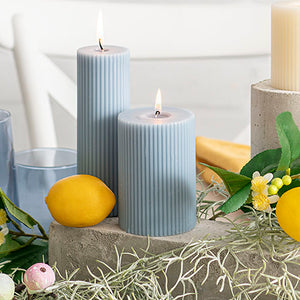 Our Roman Fluted Pillar Candle in French Blue is a plain-coloured ribbed candle that will bring textural interest to your event and home decor. Pair with other products from our Roman Fluted candle range for a complementary cluster. This candle is dripless.