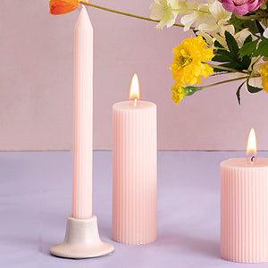 Our Roman Fluted Pillar Candle in Pale Pink is a plain-coloured ribbed candle that will bring textural interest to your event and home decor. Pair with other products from our Roman Fluted candle range for a complementary cluster. This candle is dripless.